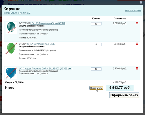 Сумма скидки зарегистрированному посетителю (клиенту компании ООО «ТК «КАРНАВАЛ») рассчитывается в корзине автоматически в соответствии с условиями предоставления скидки (смотрите раздел «Скидки», расположенный на главной странице сайта). Данная сумма скидки автоматически уменьшает итоговую сумму всего заказа.